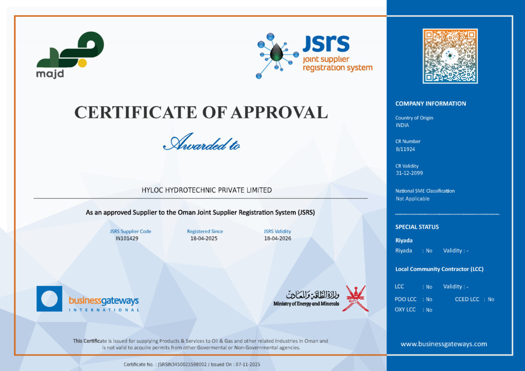 Approved Supplier to the Oman Oil & Gas Industry’s Joint Supplier Registration System (JSRS)
